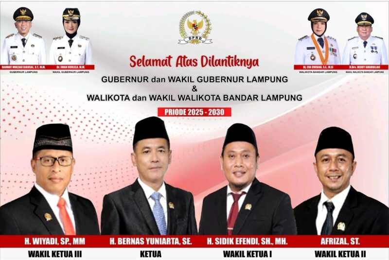 Referensinews.com – Ketua DPRD Bandar Lampung, H. Bernas Yuniarta, SE, beserta jajaran mengucapkan selamat kepada Gubernur dan Wakil Gubernur Lampung terpilih, Rahmat Mirzani Djausal dan Jihan Nurlela, serta Wali Kota dan Wakil Wali Kota Bandar Lampung, Eva Dwiana dan Deddy Amarullah, yang resmi dilantik di Istana Kepresidenan, Jakarta, Kamis (20/2/2025).